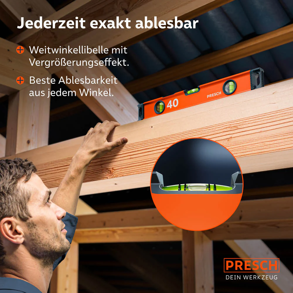 Die PRESCH Wasserwaage 40cm vereint kompromisslose Präzision mit robuster Baustellentauglichkeit. Ausgestattet mit einer gewölbten Horizontal-Libelle inklusive 2 %-Gefälleanzeige und zwei Vertikal-Libellen. Eine davon verfügt über die Vertical-View-Funktion – ideal für präzise Messungen selbst bei eingeschränkter Sicht. Dank stoßfester Gummi-Endkappen, pulverbeschichtetem Aluminiumprofil und rutschhemmender Wabenstruktur bleibt die Wasserwaage auch bei widrigen Bedingungen zuverlässig einsetzbar. Ihre hohe Messgenauigkeit von 0,5 mm/m sowie Temperaturbeständigkeit von –20 °C bis +60 °C machen sie zur idealen Wahl für anspruchsvolle Profis im Handwerk und Innenausbau. mehr erfahren >>